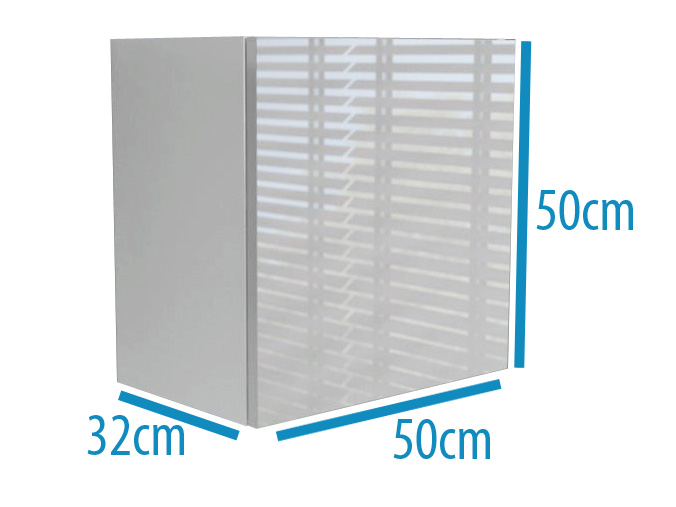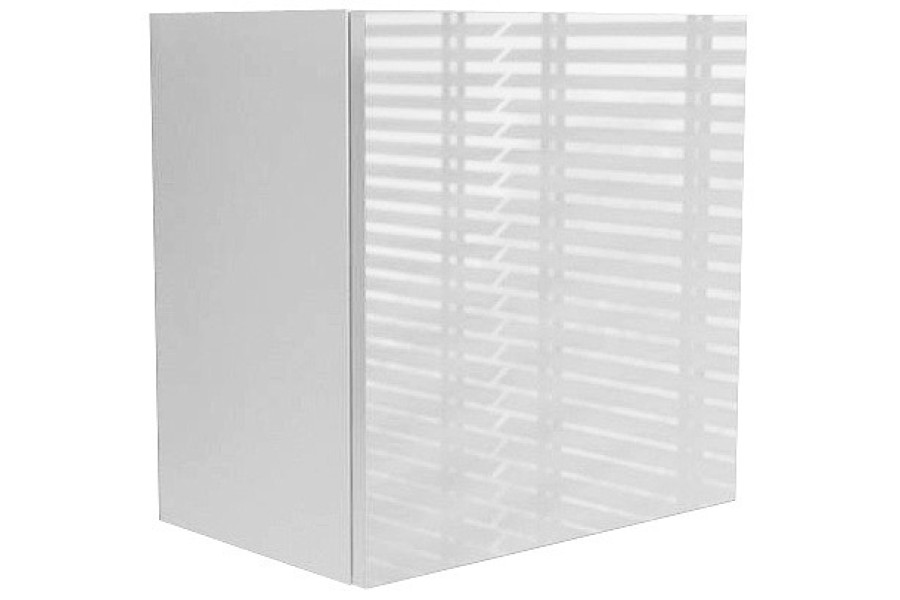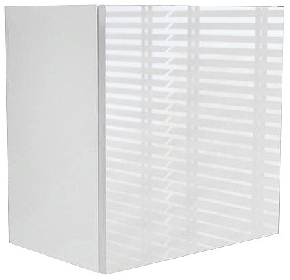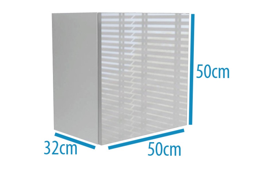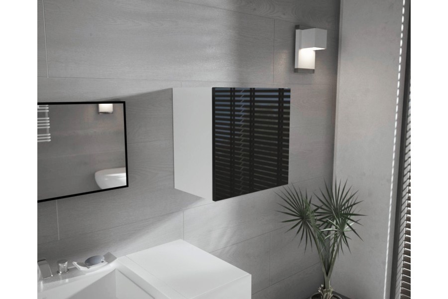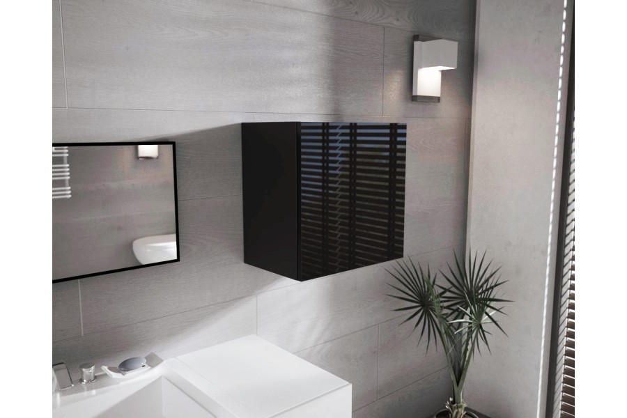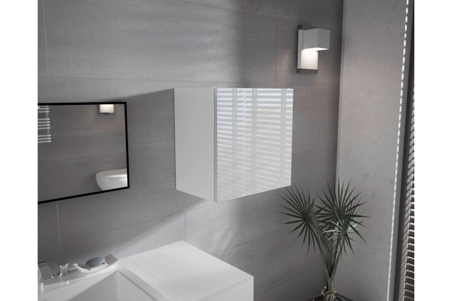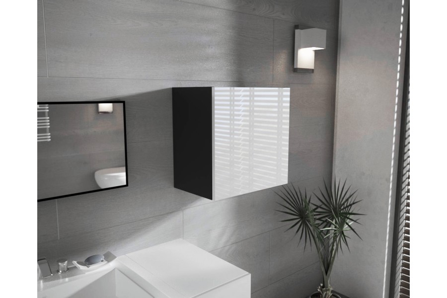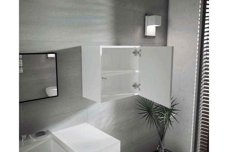 Korpus mebli i matowe fronty wykonane są z płyty wiórowej o grubości 18mm. Fronty w połysku wykonane są z płyty mdf 18mm na wysoki połyski, Szafkę wiesza się na listwie montażowej. Szafkę składa się na kołki i mimośrody. Plecy chowane są 1cm w korpus. Drzwiczki otwierają się na tip-on. Stronę otwierania drzwiczek wybiera się podczas montażu. W środku jedna półka z regulacją +/-3,2cm.