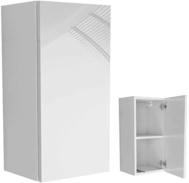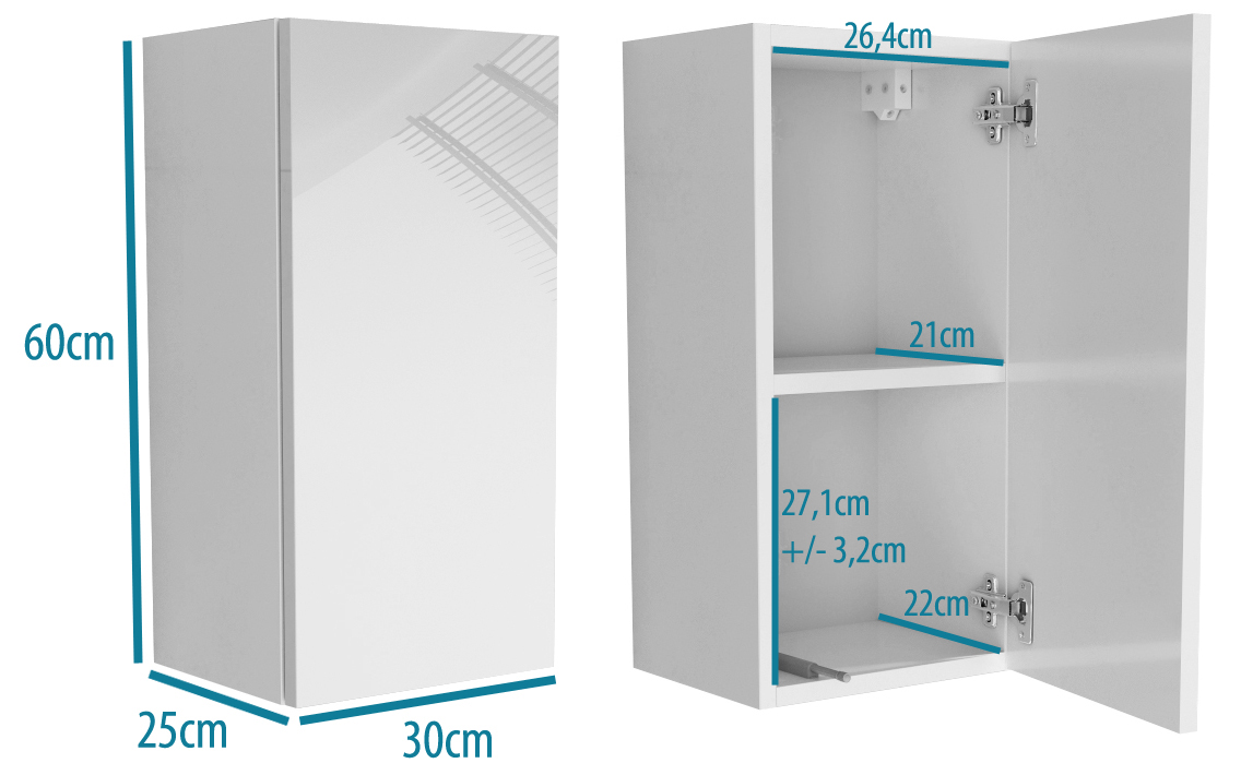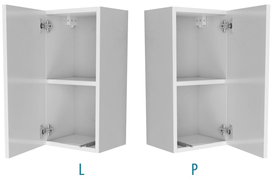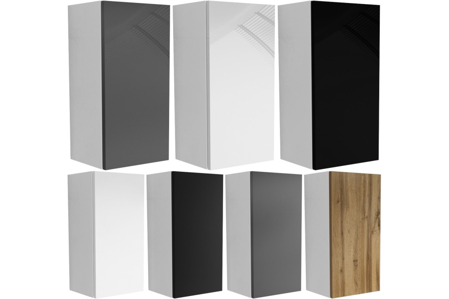 Korpus mebli i matowe fronty wykonane są z płyty wiórowej o grubości 18mm. Fronty w połysku wykonane są z płyty mdf 18mm na wysoki połyski, Szafki wiesza się na listwie montażowej. Półki za drzwiczkami mają regulację +/- 3cm. Szafkę składa się na kołki i mimośrody. Plecy chowane są 1cm w korpus. Drzwiczki otwierają się na tip-on.