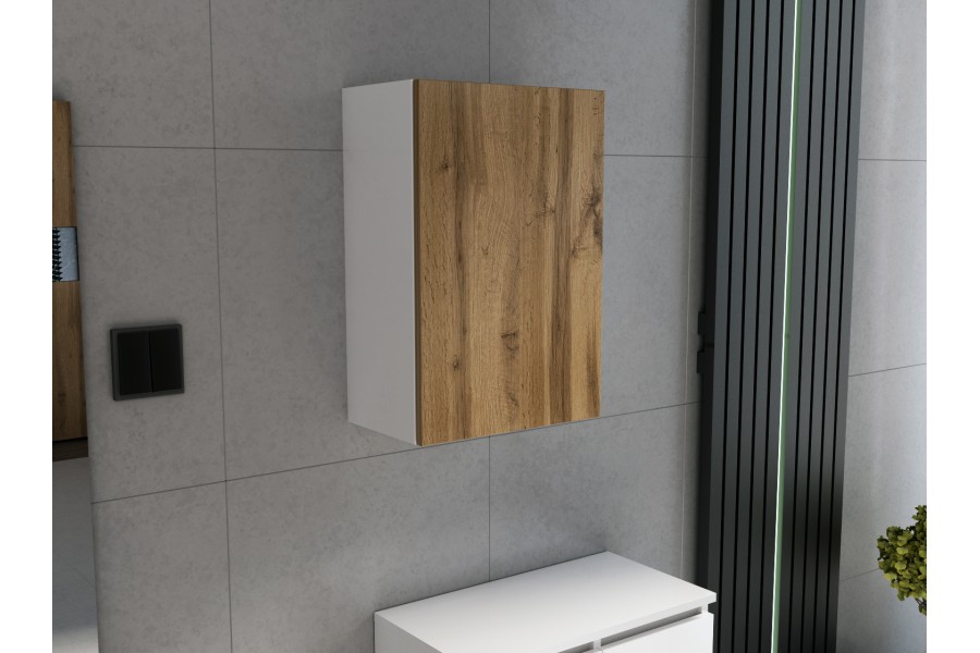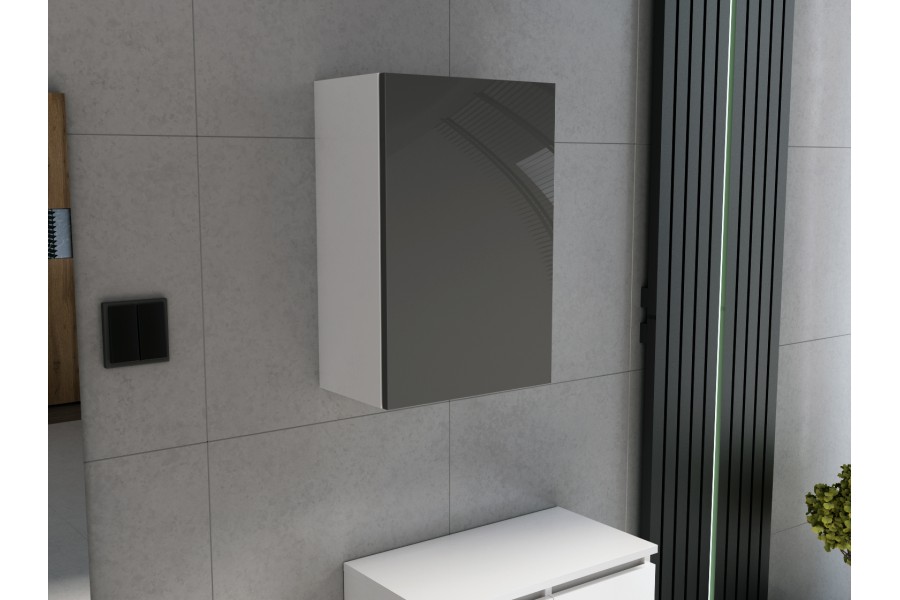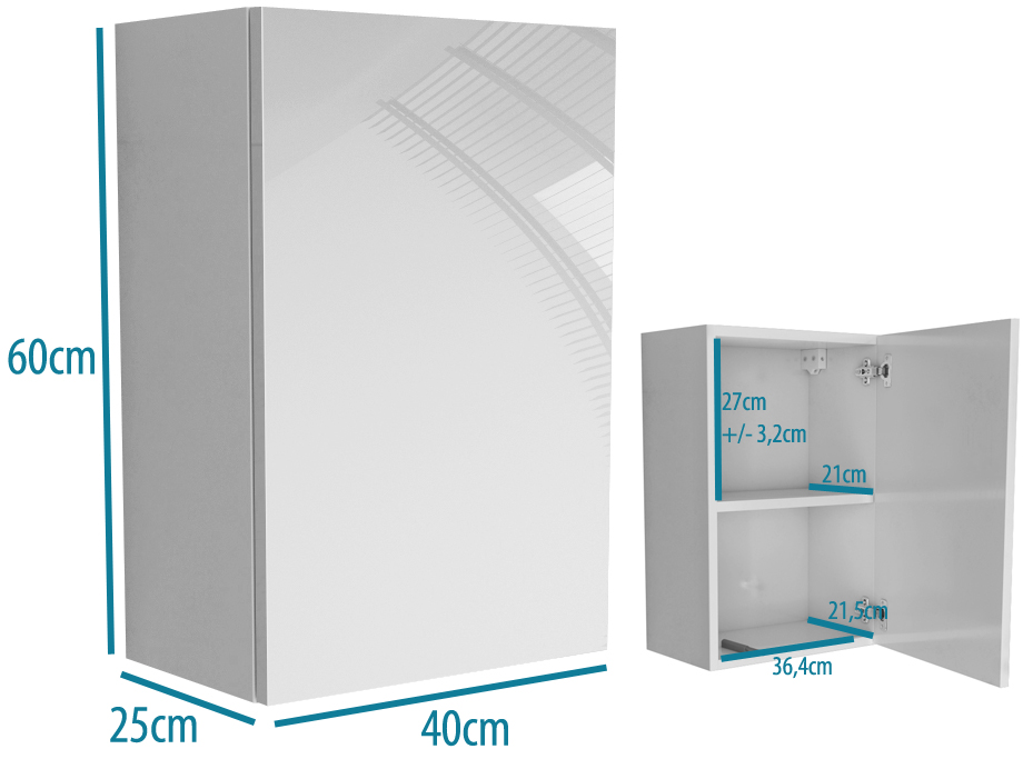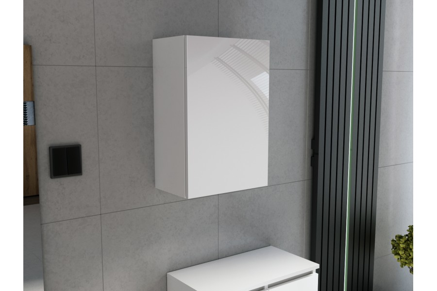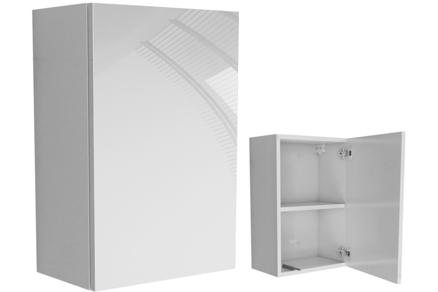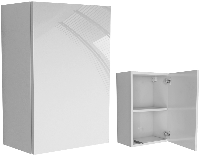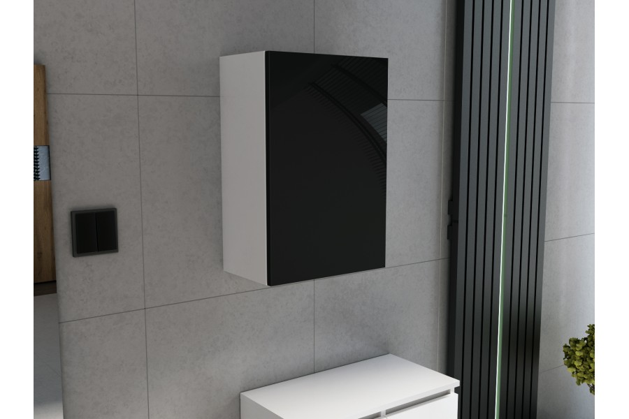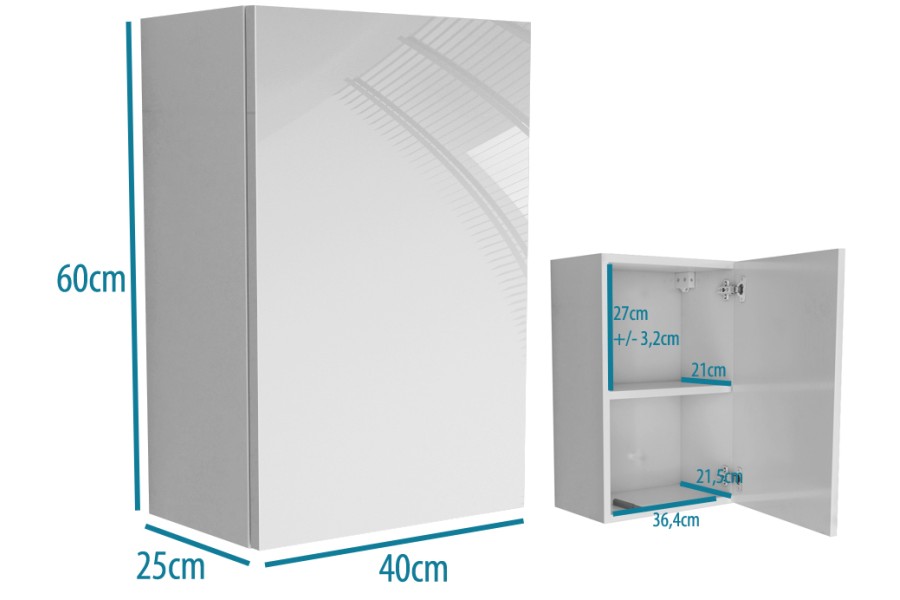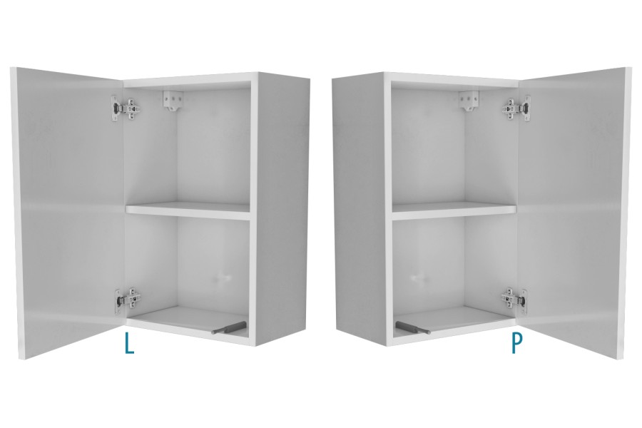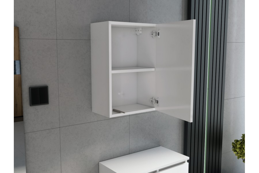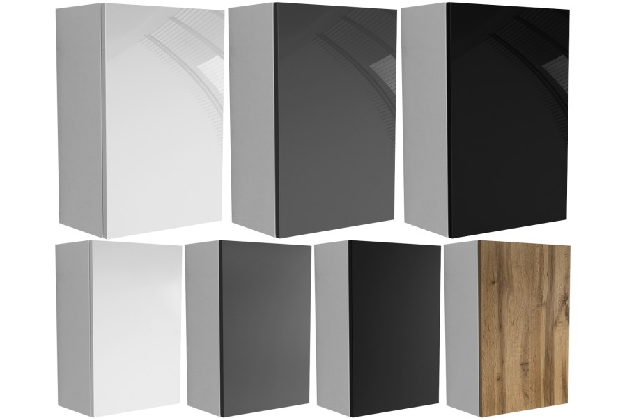 Korpus mebli i matowe fronty wykonane są z płyty wiórowej o grubości 18mm. Fronty w połysku wykonane są z płyty mdf 18mm na wysoki połyski, Szafki wiesza się na listwie montażowej. Półki za drzwiczkami mają regulację +/- 3cm. Szafkę składa się na kołki i mimośrody. Plecy chowane są 1cm w korpus. Drzwiczki otwierają się na tip-on.