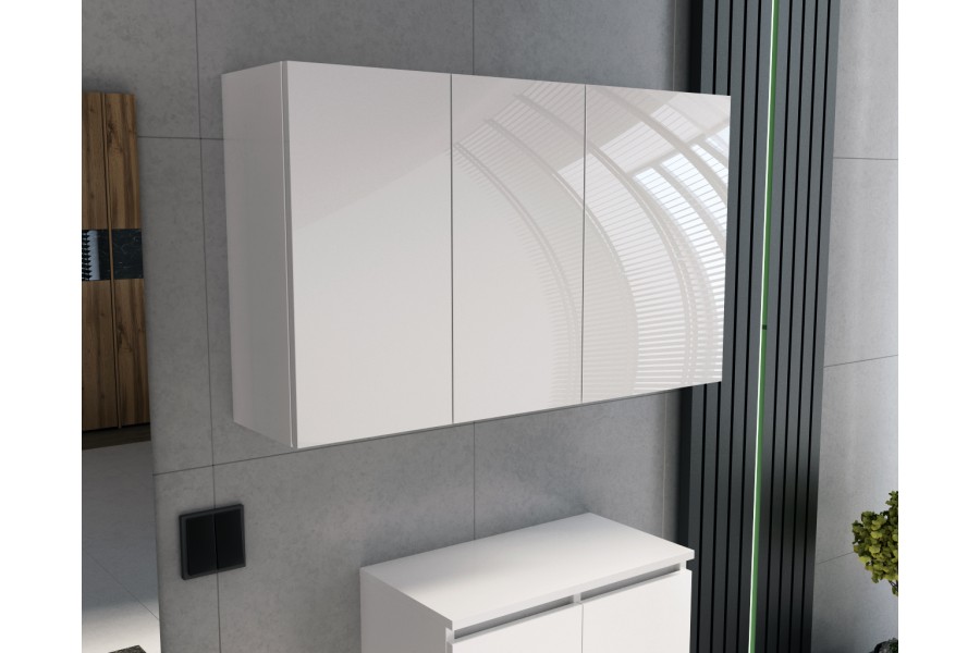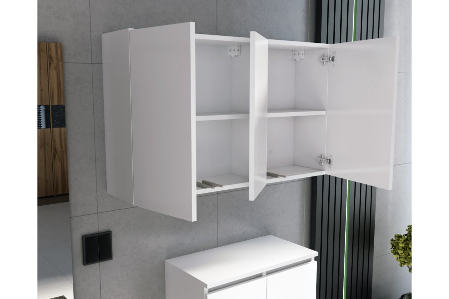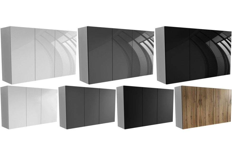 Korpus mebli i matowe fronty wykonane są z płyty wiórowej o grubości 18mm. Fronty w połysku wykonane są z płyty mdf 18mm na wysoki połyski, Szafki wiesza się na listwie montażowej. Półki za drzwiczkami mają regulację +/- 3cm. Szafkę składa się na kołki i mimośrody. Plecy chowane są 1cm w korpus. Drzwiczki otwierają się na tip-on.