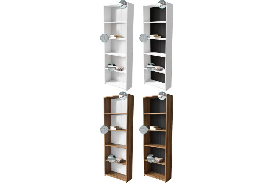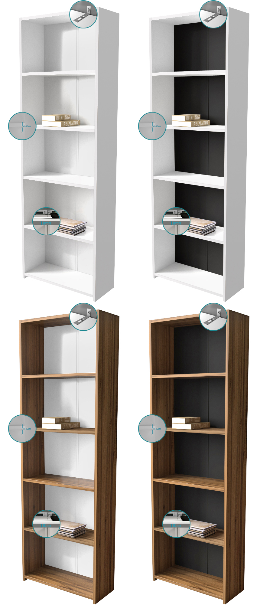 - 3 półki posiadają regulację wysokości o 3,2cm w górę lub dół, natomiast jedna półka jest skręcana na mimośród (brak możliwości regulacji).